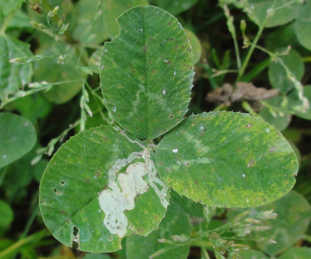 Mine d'Agromyza frontella sur une feuille de Trèfle © JOURDE Rémi - CC BY-NC