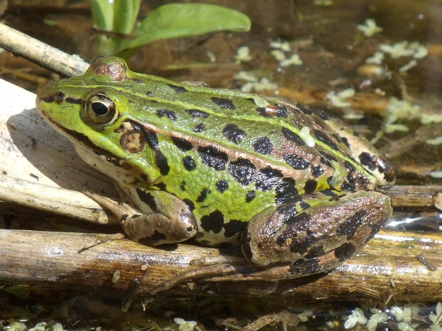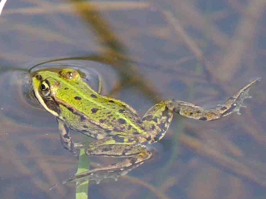 En général, il s'agit d'une "Grenouille verte" de taille moyenne qui peut atteindre au maximum 12 cm. Le museau est intermédiaire, les pattes également. Ses sacs vocaux sont gris pâle, et le tubercule métatarsien est moyen (1/3 à 1/2 de la longueur du premier orteil), saillant (forme de demi-lune) et dur. Les pelotes copulatrices sont de couleur grise et l'iris est noir ponctué de jaune ou jaune ponctué de noir.
